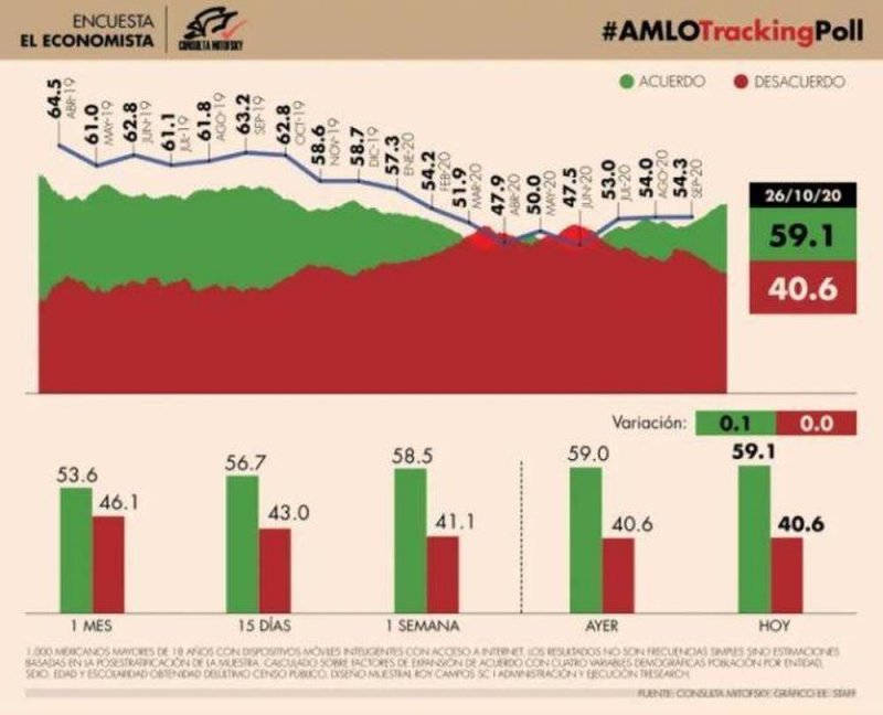 La encuesta «AMLO Tracking Poll» del diario El Economista, destaca que la aprobación del presidente Andrés Manuel López Obrador al 26 de octubre es de 59.1 por ciento, contra el 40.6%