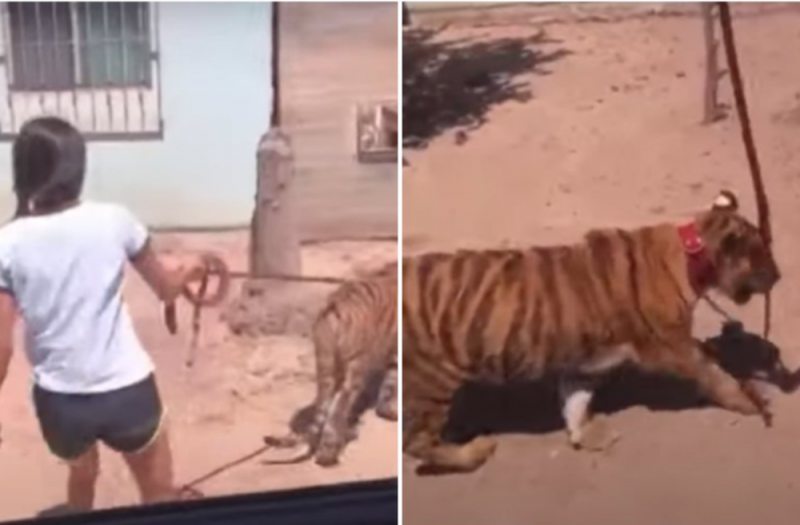 Una niña preadolescente fue captada en un video, viralizado en redes sociales, donde se le ve pasear a un tigre de bengala con una correa en su cuello, como si se tratara de un perro, en el municipio de Guasave, Sinaloa.