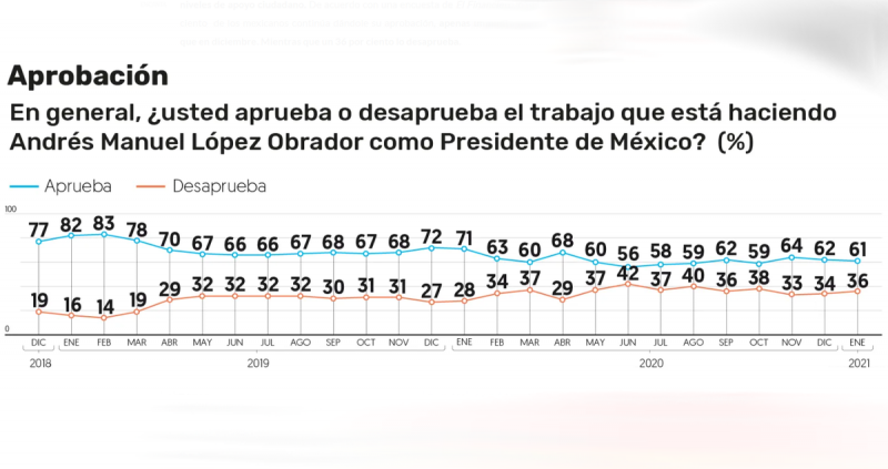Durante el mes de enero del año que recién comienza, el tabasqueño mantuvo sus niveles de apoyo ciudadano. De acuerdo con una encuesta de El Financiero, 61 por ciento  de los mexicanos continúa dándole su aprobación, apenas un punto menos que en diciembre. Mientras que un 36 por ciento lo desaprueba.