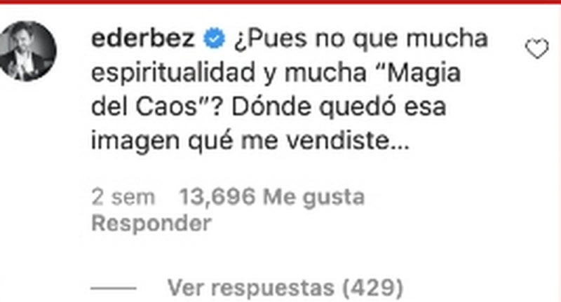Yo no la eduqué así. Eso ha de venir del lado de su mamá, comentó el actor en la primera publicación y en la segunda reafirmó su postura: ¿Pues no que mucha espiritualidad y mucha Magia del Caos? Dónde quedó esa imagen qué me vendiste.