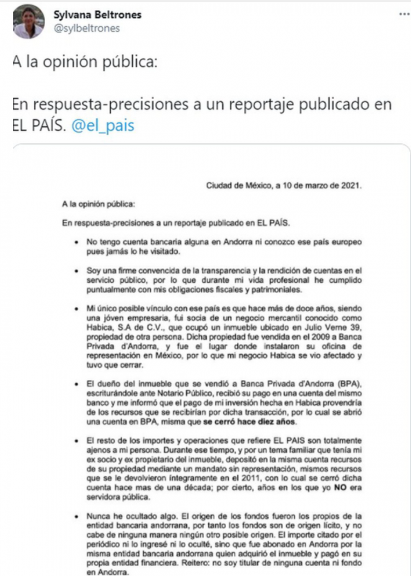 “Soy una firme convencida de la transparencia y la rendición de cuentas en el servicio público, por lo que durante mi vida profesional he cumplido puntualmente con mis obligaciones fiscales y patrimoniales”, añadió en el texto donde aclaró que su único “posible vínculo” con Andorra es que hace más de una década fue socia de un negocio mercantil llamado Habica, S.A. de C.V., que ocupaba un inmueble propiedad de otra persona en la calle Julio Verne número 39?, mencionó.