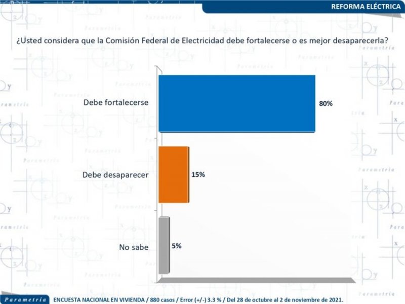 Dentro de la encuesta realizada por Parametría se destaca que el 80 por ciento de los encuestados consideró que la CFE debe fortalecerse frente al 15 por ciento que opta por desaparecerla.