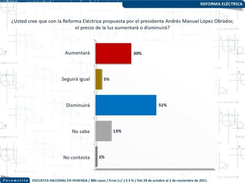 Por otra parte, con relación al precio de la energía eléctrica una mayoría de 51% de respuestas se inclinó por indicar que no subirá su costo con las reformas de AMLO.