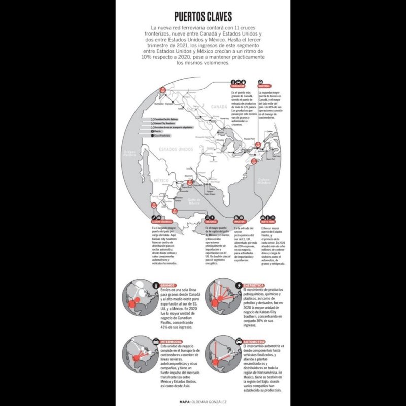 Con ello, puertos de ambos extremos de Canadá, como Vancouver y Saint John, conectarán con la región del medio oeste estadounidense que, a su vez, llevará a otras paradas en el sur de Texas y Nueva Orleans, y alimentará los cruces fronterizos de Laredo y Brownsville hacia México, un componente clave de la fusión.