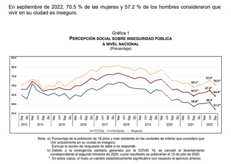 Es importante señalar que en diciembre de 2018, la percepción de inseguridad por temor al delito a nivel nacional era del 73 %, lo demuestra que durante la administración del presidente Andrés Manuel López Obrador se tiene registro de una disminución porcentual de 8.6%, frente al 64.% que se registró en septiembre de este año.