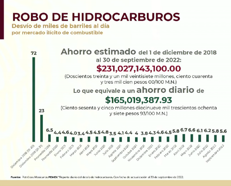 Rosa Icela Rodríguez, secretaria de Seguridad, señaló que esta disminución en el robo de barriles ha significado un ahorro de 231 mil 27 millones 143 mil 100 pesos, lo que equivale a un ahorro diario de más de 165 millones de pesos.