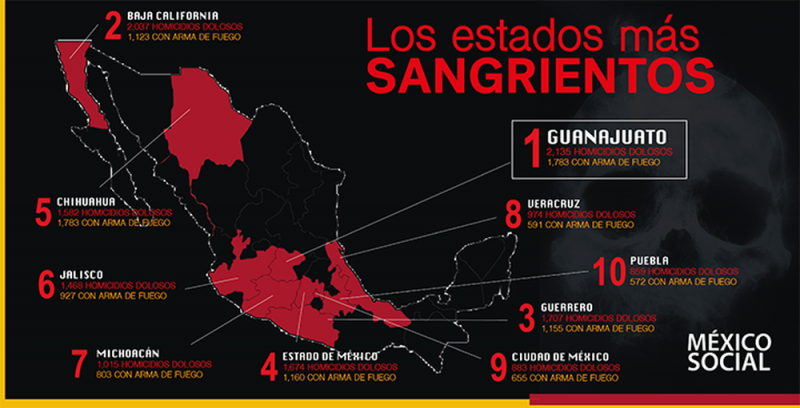 Desde 2018, Guanajuato es el estado que concentra la mayor cantidad de homicidios dolosos en México.