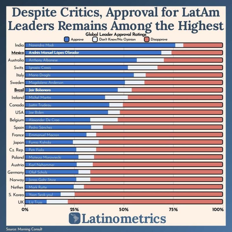 AMLO se convierte así en el presidente con mayor aprobación de Latinoamérica, superando en 5 lugares a Brasil, donde se encuentra Jair Bolsonaro con solo 49% de simpatía para sus ciudadanos. México incluso supera a Australia, Suiza, Italia y Suecia.