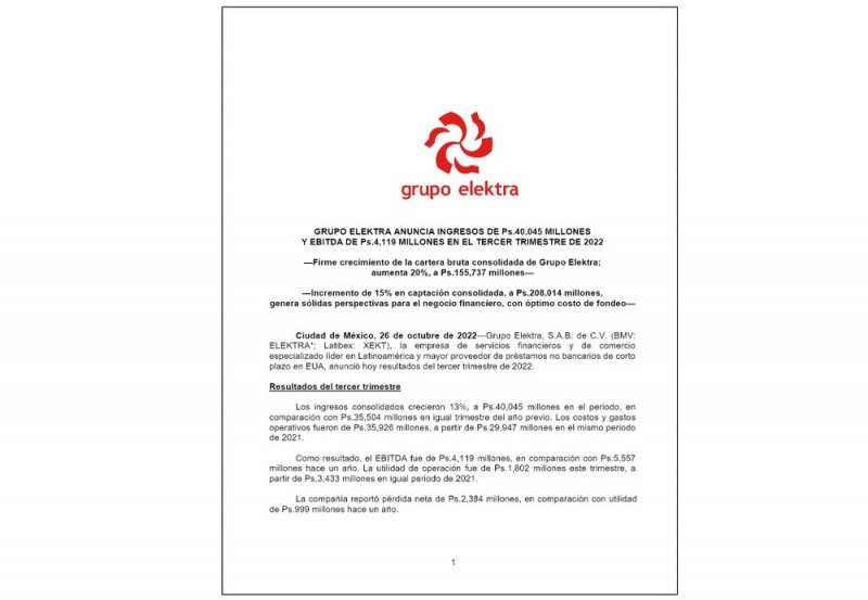 Grupo Elektra, propiedad de Ricardo Salinas Pliego, reportó una pérdida neta de 2 mil 384 millones de pesos en el tercer trimestre de 2022, en comparación con los 999 millones de pesos en ganancias registrados en el mismo periodo de 2021, según reportó la empresa en su informe enviado a la Bolsa Mexicana de Valores (BMV).