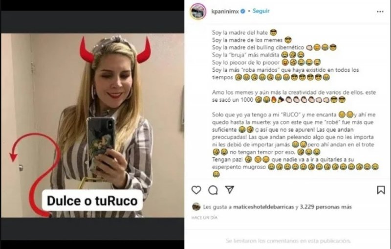 Con motivo del Halloween, algunos usuarios de redes sociales difundieron una fotografía de Karla Panini con cuernos y cola de diablo, así como con esta leyenda: "dulce o tuRuco". La ex esposa del comediante Óscar Burgos, mejor conocido como "El Perro Guarumo" (padre de su hijo Cesar Gabriel), reposteó este meme y a manera de broma, manifestó ser la bruja más maldita y la más roba maridos que haya existido en todos los tiempos.