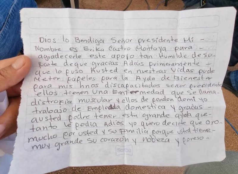 “Dios lo bendiga señor presidente (…) para agradecerle este apoyo tan humilde de su parte de que gracias a Dios primeramente que lo puso a usted en nuestras vidas pude meter papeles para la ayuda de Bienestar para mis hnos discapacitados”, narró la mujer.