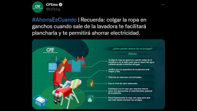 En la misma publicación, la CFE recomendó verificar que la superficie de la plancha esté limpia y lisa, planchar en sesiones concentradas y usar el nivel de calor adecuado.