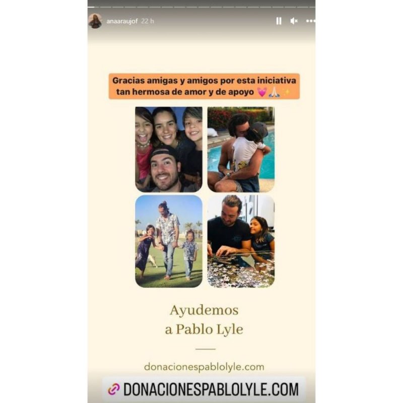 Ana Araujo, esposa de Lyle, agradeció dicha iniciativa e invitó a donar: "Gracias amigas y amigos por esta iniciativa tan hermosa de amor y de apoyo", se lee en el mensaje; la iniciativa llamada "Ayudemos a Pablo Lyle", contiene fotografías de él con sus hijos y Araujo.