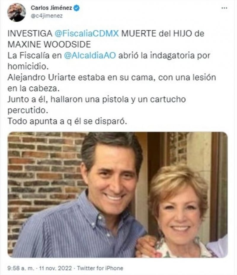 "INVESTIGA @FiscaliaCDMX MUERTE del HIJO de MAXINE WOODSIDE La Fiscalía en @AlcaldiaAO abrió la indagatoria por homicidio. Alejandro Uriarte (sic) estaba en su cama, con una lesión en la cabeza. Junto a él, hallaron una pistola y un cartucho percutido. Todo apunta a q él se disparó", compartió el comunicador en sus redes sociales, información que ha sido retomada por varios medios de comunicación.