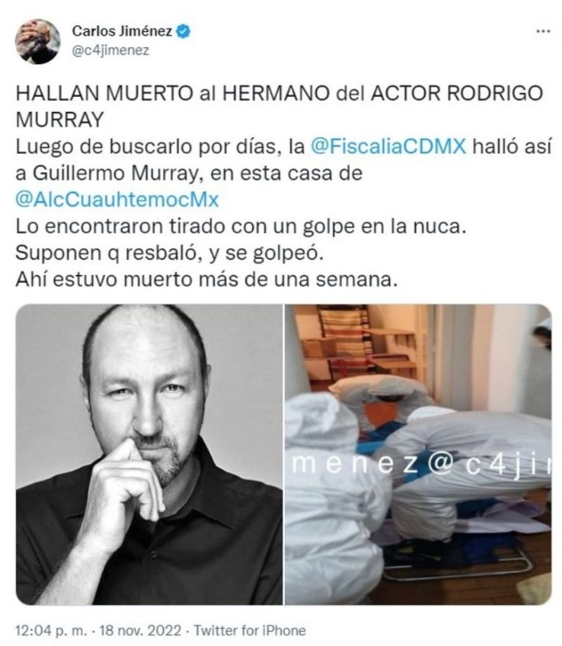 Una vez más el actor Rodrigo Murray sufre la muerte de un ser querido, luego de que su papá, el histrión Guillermo Murray falleciera el 6 de mayo de 2021, ahora trascendió la noticia de que su hermano, Guillermo Murray Jr, fue encontrado muerto en su casa, luego de varios días desaparecido, aunque hasta el momento el también comediante no ha hecho declaraciones al respecto.