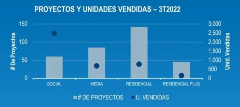 De acuerdo con la firma de análisis inmobiliario Tinsa, durante el tercer trimestre del 2022 se colocaron 4,097 unidades, es decir una caída de 6.5% respecto al periodo anterior. De acuerdo con los datos registrados, del total de viviendas desplazadas, 47% corresponde a departamentos y 53% a hogares horizontales.