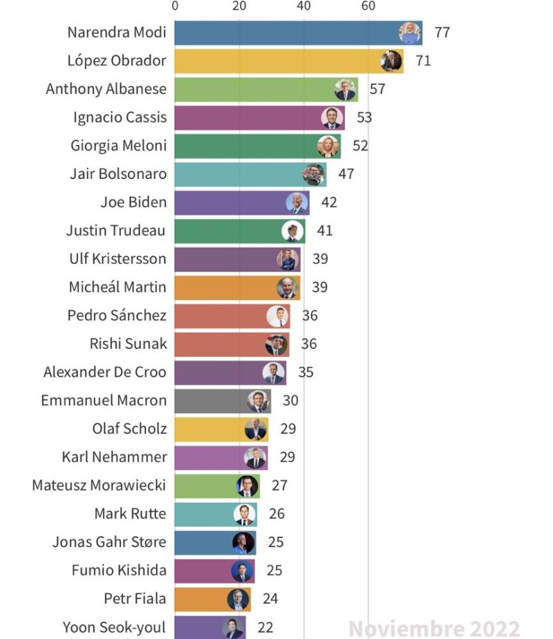 Te compartimos la gráfica más actualizada de la encuestadora estadounidense que mide la popularidad de los mandatarios en el mundo