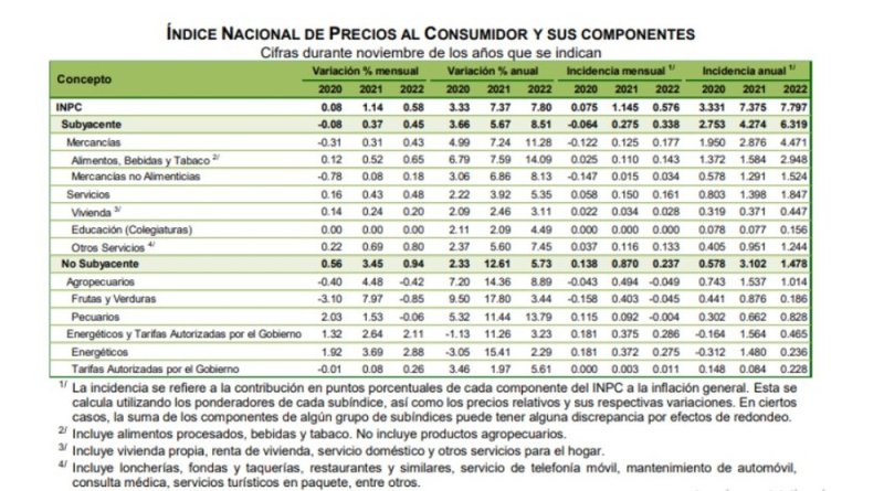 “EN NOVIEMBRE DE 2022, LA VARIACIÓN ANUAL DEL INCP FUE DE 7.8% Y LA DE LOS ÍNDICES SUBYACENTES Y NO SUBYACENTE FUE DE 8.51 Y 5.73 % RESPECTIVAMENTE. EN EL MISMO PERIODO DEL AÑO ANTERIOR, EL INCP CRECIÓ 7.37% Y SUS COMPONENTES, 5.67 Y 12.61 % EN ESE ORDEN”, SEÑALA EL INEGI.