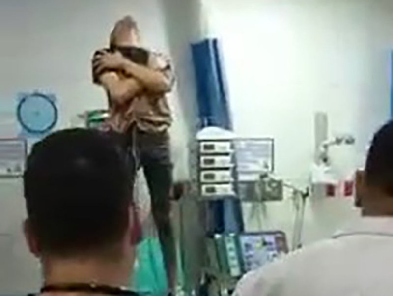 Mientras todo esto ocurre, algunos médicos y camilleros intentan hablar con el joven para calmarlo.