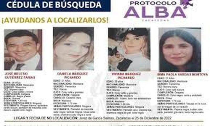 El gobierno de Zacatecas emitió una alerta Alba para la búsqueda y localización de las cuatro personas, desaparecidas desde el 25 de diciembre pasado.
