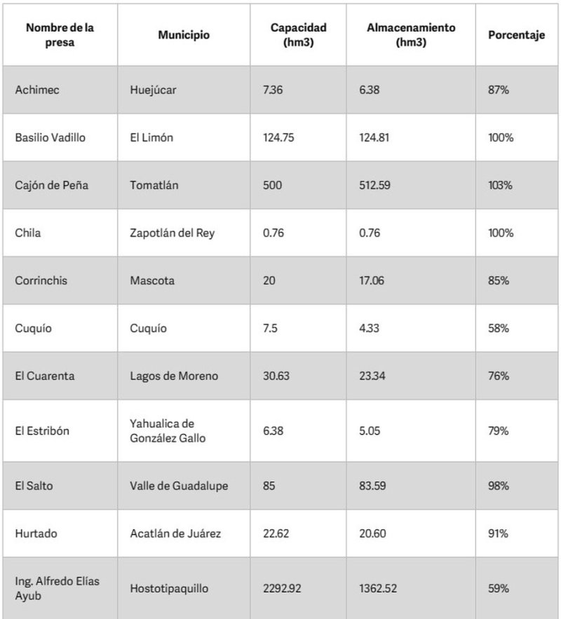 Este temporal cerró con ocho presas al 100% de su capacidad. Actualmente se mantiene en ese mismo nivel la presa de Chila, ubicada en Zapotlán del Rey, las presas de Basilio Vadillo, en el municipio de El Limón; la presa El Salto, en Valle de Guadalupe, y Cajón de Peña en Tomatlán. Mientras que la Presa Ing. Santiago Camarena, en Teuchitlán, sobrepasa su capacidad.
