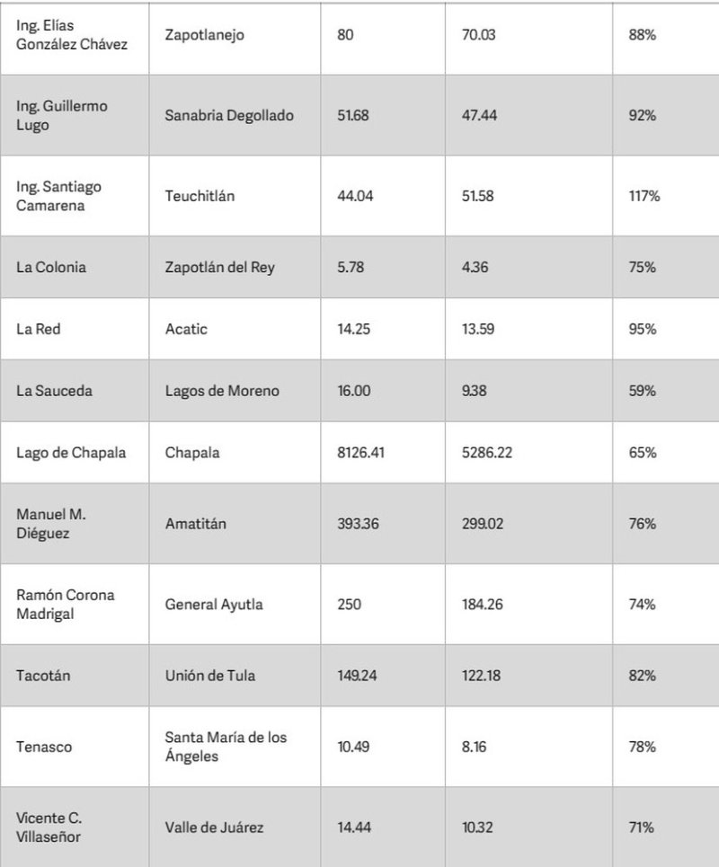 Las 23 presas de Jalisco están al 83% de su capacidad, en promedio, de acuerdo con información de la Comisión Nacional del Agua, con corte al 28 de diciembre de 2022. Entre todas suman 12 mil 253.60 hectómetros cúbicos de capacidad; un hectómetro cúbico equivale a mil millones de litros.