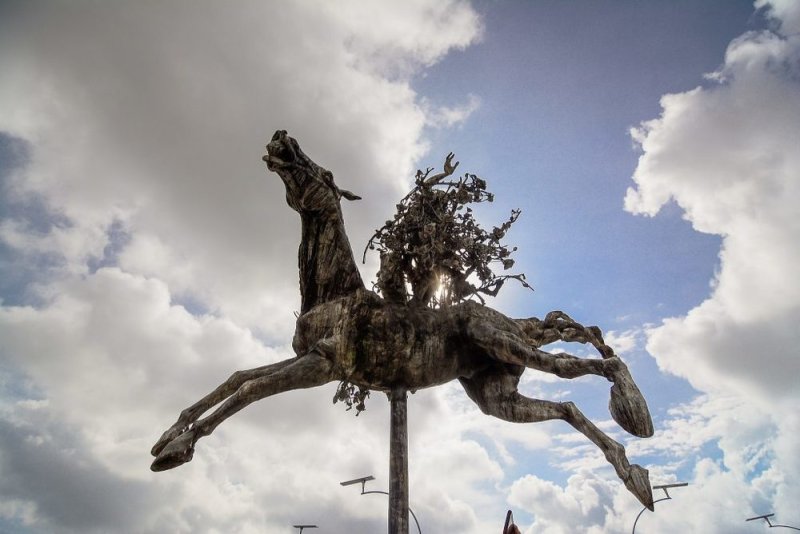 La escultura dañada “La Belleza”, junto con “La Abundancia” y “La Alegría” son parte de la obra de Sergio Garval que se colocaron en lo alto de la Calzada Lázaro Cárdenas.
