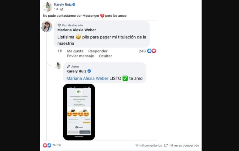 Tiempo después, la influencer hizo una publicación en su página de Facebook, en la cual se ve una captura de pantalla del comentario de la fan pidiendo el favor.