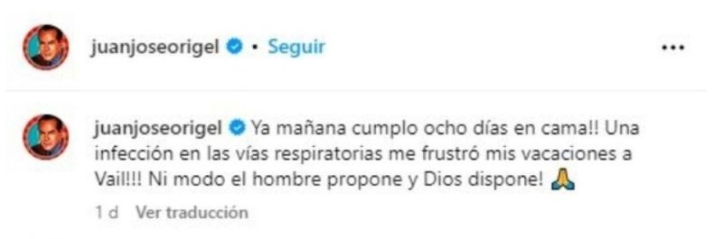 “Ya mañana cumplo ocho días en cama., una infección en las vías respiratorias me frustró mis vacaciones a Vail, Ni modo el hombre propone y Dios dispone” fue el texto que escribió Pepillo Origel, quien de inmediato comenzó a recibir cientos de mensajes de parte de sus fans y hasta de otras celebridades de la farándula en los que se le deseó una pronta recuperación.