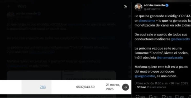 Aunque fue mediante un mensaje, el tono y las palabras que usó el presentador de Multimedios, detona una clara irá en contra de los presentadores del matutino de Imagen TV, a los que incluso les añadió capturas de pantalla en el que demuestra que la cantidad que está generando es de verdad: "Lo que ha generado el código CRISTA en @nectemx + lo que ha generado la monetización del canal en solo 2 días. De aquí sale el sueldo de todos sus conductores mediocres @saleelsoltv".