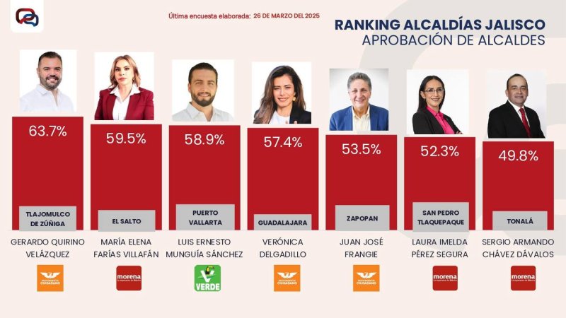 El ranking también ubica a María Elena Farías Villafán (El Salto, Morena) con 59.5% y Luis Ernesto Munguía Sánchez (Puerto Vallarta, Verde) con 58.9%, como los siguientes alcaldes con mayor respaldo ciudadano. Por su parte, Verónica Delgadillo, de Guadalajara, y Juan José Frangie, de Zapopan, ambos de Movimiento Ciudadano, registran 57.4% y 53.5%, respectivamente. Morena también aparece en la lista con Laura Imelda Pérez Segura en San Pedro Tlaquepaque (52.3%) y Sergio Armando Chávez Dávalos en Tonalá (49.8%).