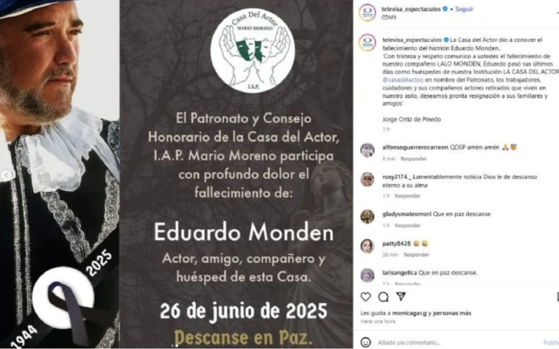 La Asociación Nacional de Actores también reaccionó al sensible fallecimiento de Monden, publicando un mensaje de despedida y dándole el peso a sus seres queridos y fans: "La ANDA lamenta profundamente el fallecimiento de nuestro Compañero Eduardo Monden, miembro de nuestro sindicato y huésped de la Casa del Actor. Nuestras sentidas condolencias a familiares, amigos/as y compañeros/as