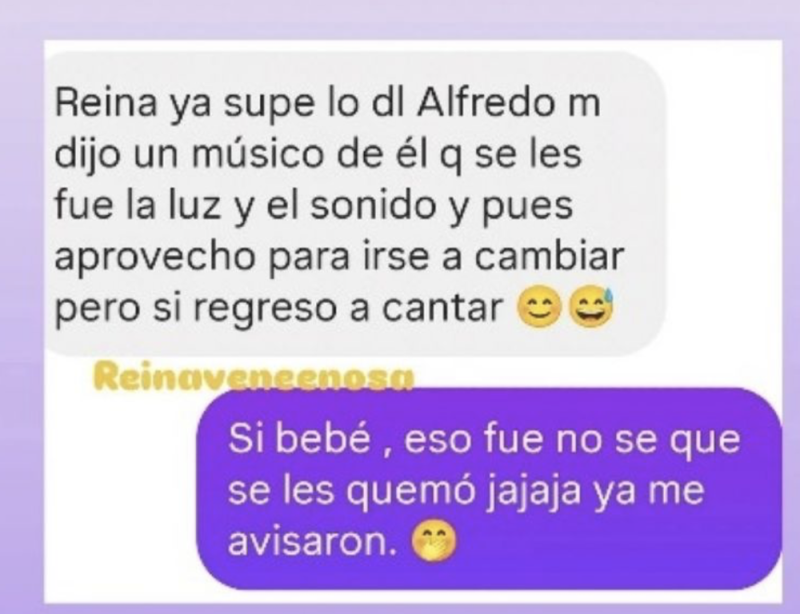 En el primer mensaje, un músico de Alfredo Olivas dijo que presentaron problemas con la luz en el Palenque de Pachuca. El cantante de música regional habría aprovechado el inconveniente para irse a cambiar de vestuario, pero sí regresó al escenario.