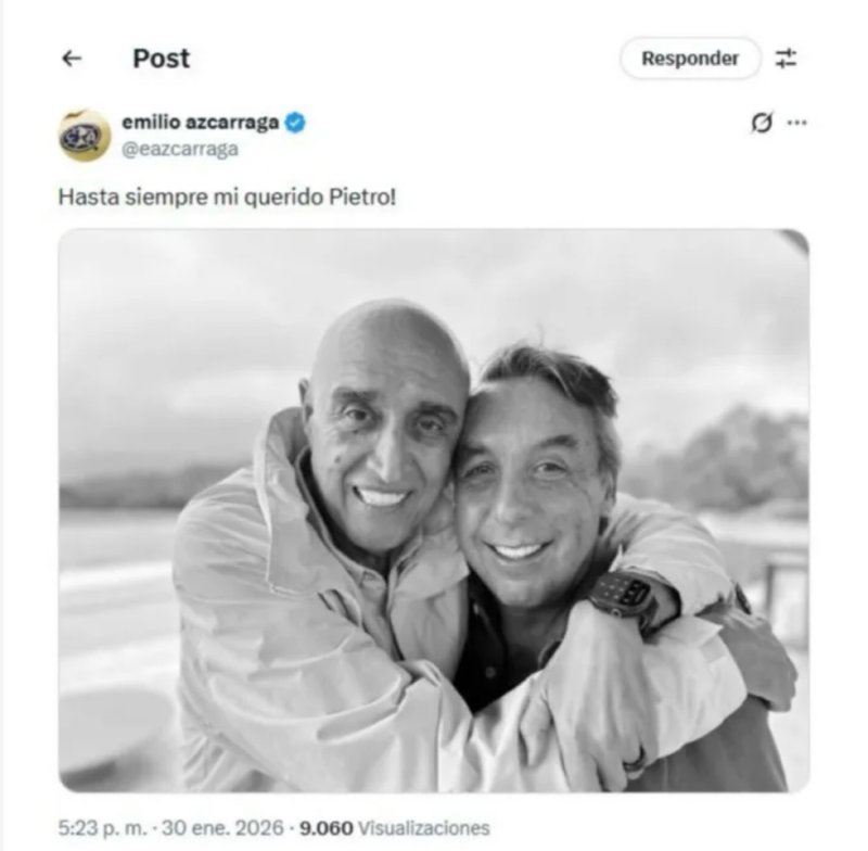 A través de su cuenta oficial en X, Azcárraga Jean compartió una fotografía en blanco y negro en la que aparece abrazando a Torres, acompañada del texto: “Hasta siempre, mi querido Pietro”, en alusión al apodo con el que se refería al productor, con quien mantuvo una relación cercana personal y profesional.