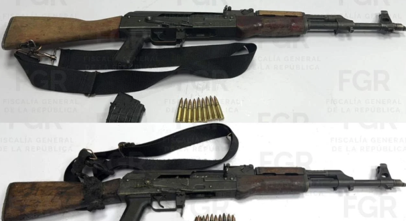 Entre los objetos asegurados se encuentran dos granadas de fragmentación, cuatro rifles de asalto, tres pistolas, 12 cargadores, 126 cartuchos, un chaleco antibalas, siete pantalones tipo militar, una máquina para contar billetes y un vehículo.