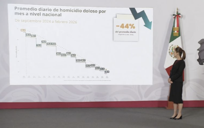 “La reducción en homicidios de septiembre de 2024 a febrero de 2026 es del 44 por ciento, es una reducción continua, febrero es el mes más bajo desde hace por lo menos 10 años, son 38 homicidios diarios menos que en septiembre de 2024.