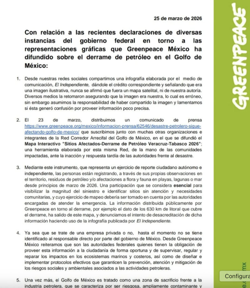 La Presidenta Claudia Sheinbaum evidenció la mentira de la organización ambientalista Greenpeace sobre la magnitud del derrame de hidrocarburos en el Golfo de México de la cual incluso tuvieron que retractarse.