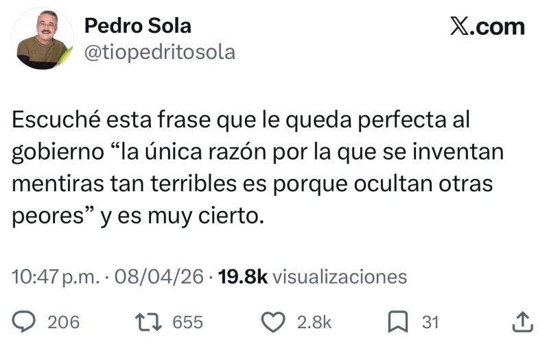 A través de un mensaje, Sola retomó una frase que, según dijo, describe con precisión la situación actual: “la única razón por la que se inventan mentiras tan terribles es porque ocultan otras peores”. El comentarista aseguró que dicha idea refleja lo que, a su juicio, ocurre en el ámbito gubernamental.