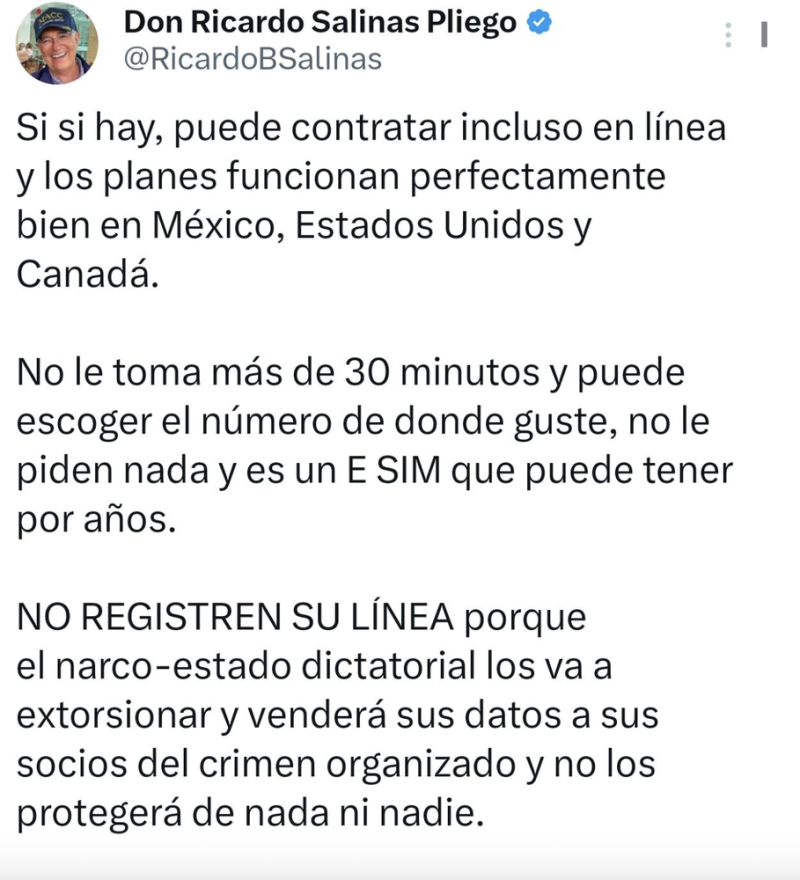De acuerdo con información difundida recientemente, el dueño de Grupo Salinas respondió a una publicación del creador de contenido Werevertumorro, quien cuestionaba si era posible contratar una línea telefónica sin registrar la CURP. En ese contexto, el empresario señaló que existen opciones para adquirir servicios móviles en el extranjero que funcionan en México sin necesidad de proporcionar datos personales.