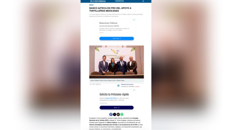 De acuerdo con versiones difundidas en redes sociales,Homero López presidente del Consejo Nacional de la Tortilla, habría firmado en noviembre pasado una alianza con Banco Azteca, empresa perteneciente al empresario Ricardo Salinas Pliego.